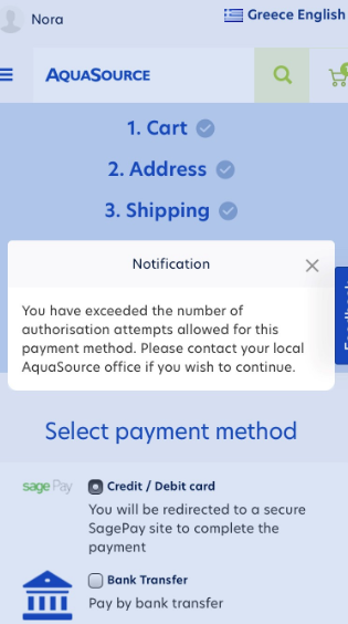 If you are paying by Card with the 'Sage Pay' option and you fail to complete the transaction with the same card 3 times, Sage Pay will send you back to the site to get you to try another option.